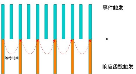 该图上方是事件触发的次数,下方是响应函数触发的次数,可以发现在事件大量被触发时(色块密集),响应函数并没有被触发。当事件停止触发一段事件后(三个色块的时间间隔)后,响应函数才会被真正的触发。