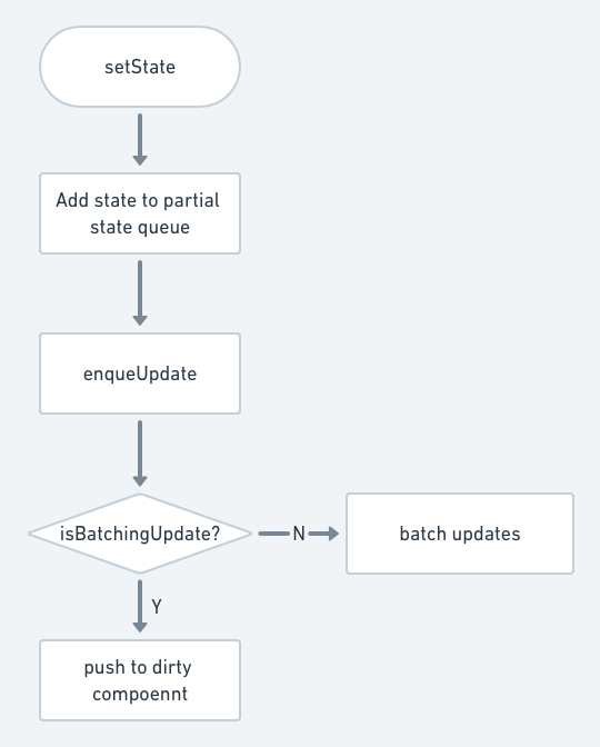setState的内部调用栈如上图所示,略去一些细枝末节的代码之后,简化为如下的流程图。