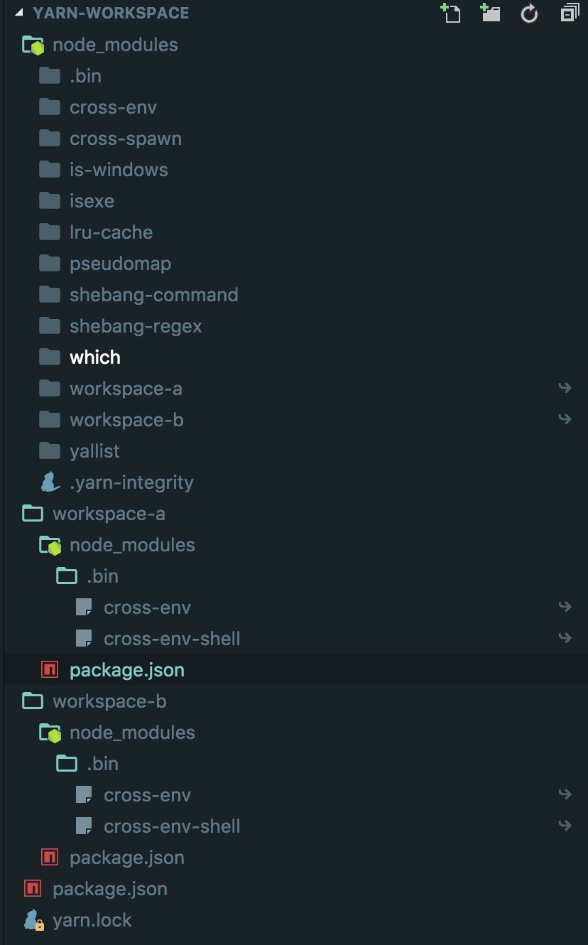 你会发现整个repo只生成了一份yarn.lock,绝大多数的依赖包都被提升到了根目录下的node_modules之内。各个子project的node_modules里面不会重复存在依赖,只会有针对根目录下cross-env的引用。不仅如此,你会发现,对于repo内部的依赖关系(比如workspace-b依赖于workspace-a),yarn也能很好的进行管理。